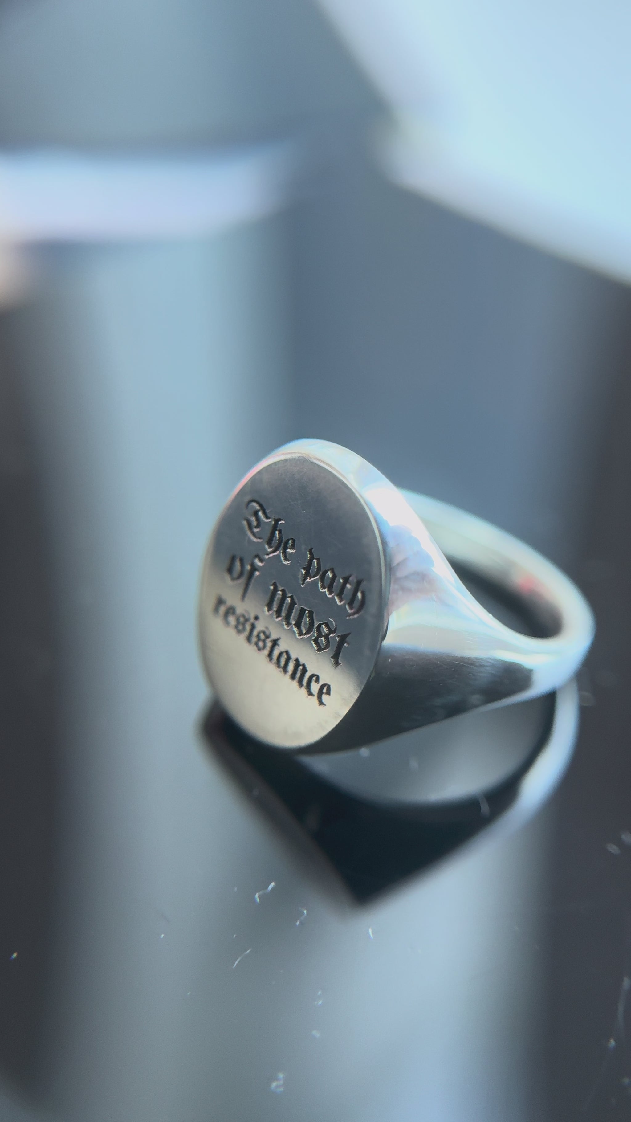 The oval mirror signet face of The Brahmanda Glyph is a canvas for your personal myth. Whether you choose to engrave it with a name, a phrase, a symbol, or an emoji, it becomes a talisman — a silver whisper of what matters most to you. Our engraving process allows you to bring your vision to life with absolute precision. A mantra in Devanagari? A birth date in Roman numerals? A simple 🕊 or 🌌? The glyph can hold it all.